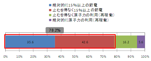 15%以上の節電と原子力の利用(再稼働)のどちらを選びたいかを尋ねたところ、圧倒的に15%以上の節電を選ぶ人が多く、全体の8割に及んだ。 前問(Q6)で節電疲れを感じない=59.8%から見てわかるように、節電意向(意識)が高いことが窺える。