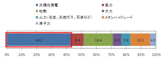 今後日本ではどのエネルギー源を基盤にしていくべきかを尋ねたところ、「太陽光発電」が最も多く、43.2%。次いで、「地熱」(19.4%)、「メタンハイドレード」(13.2%)と安全な自然エネルギーが続く。