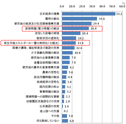3位の「被災地の経済及び生活環境復興支援」のランクインからも復興への関心度は高いことがわかるが、関連して原発問題への期待度も高く4位に「原発問題(電力問題)の解決」(26.8%)や「再生可能エネルギーの一層の実用化(太陽光)」(13.8%)なども後に続く。