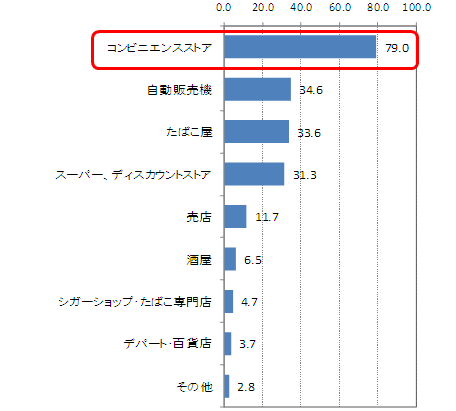 普段たばこを購入する場所を尋ねたところ、圧倒的に「コンビニエンスストア」がトップで79.0%。次いで、「自動販売機」34.6%、「たばこ屋」33.6%、「スーパー、ディスカウントストア」31.3%と続く。