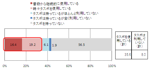 普段のタスポ利用を尋ねたところ、「普段から継続的に使用している」人は16.4%と10%台に留まる。一方で、タスポ自体を持っていない人が全体の半数以上を占める(56.5%)。