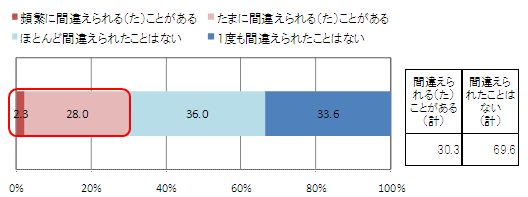 コンビニエンスストアでたばこを購入する際、銘柄を「間違えられる(た)経験がある(計)」のは30.3%。「頻繁に間違えられる(た)ことがある」のは僅かに2.3%に留まる。