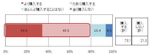 コンビニエンスストアでたばこを購入する時のついで買い有無を尋ねたところ、78.1%の人が「購入する(計)」と回答している。