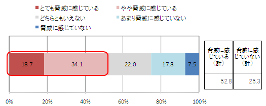 3月の大震災が原因で起こった原子力発電所事故により、放射線量/放射性物質への注目が高まった。そこで、放射線量/放射性物質の脅威を尋ねたところ、全体の52.8%が脅威を感じていた。