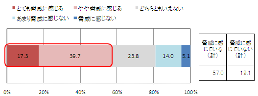 たばこの煙に含まれる成分の1つに「ポロニウム210」というのがあり、これは発がん性の高い物質になる。また、体内にたまると高濃度になり、局所的に放射線量が集中することになると言われている。この成分の特徴を認知してもらった上で、たばこに対しての脅威を尋ねたところ、「脅威に感じている(計)」人は57.0%。先の質問で、原子力発電事故で、放射線量や放射性物質に「脅威を感じている(計)」52.8%の回答を上回る結果となった。