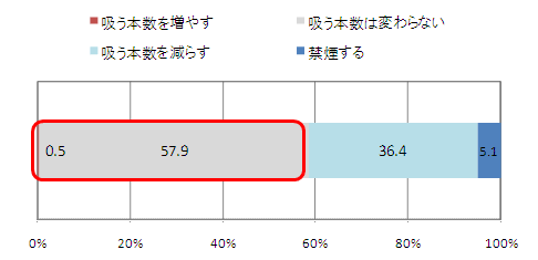 しかしながら、これが禁煙に直接的には結びつかないようだ。この説明を読んだ後にたばこの本数の変化について尋ねたところ、「禁煙する」と回答した人は僅かに5.1%。「吸う本数を減らす」と回答した人は36.4%。「本数は変わらない」と回答した人がこれらを上回り、57.9%と半数以上を占めた。