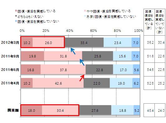 ただし、関東圏(東京都、神奈川県、千葉県、埼玉県、群馬県)で見ると、回復・復旧を実感している(計)は48.4%と前回までとほぼ同じ傾向を見せ、関西圏との温度差があることが窺える。