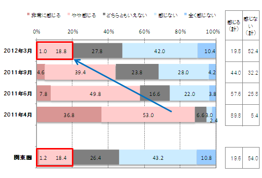 世間全体での自粛ムードについて、実感しているかを尋ねたところ、「自粛ムードを感じる(計)」は19.8%と前回に比べて約25ポイント下回る。地域別に見ると、関東圏の自粛ムードの実感度も19.6%で全体と差がなく、震災から1年が経過し人々の生活が震災前の状態に戻りつつあることが窺える。