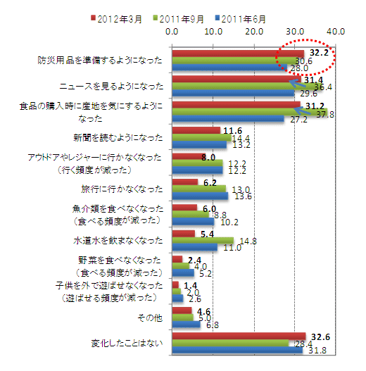 大震災を契機にした生活の変化は、「防災用品を準備するようになった」(32.2%)、「ニュースを見るようになった」(31.4%)、「食品の購入時に産地を気にするようになった」(31.2%)人が多い。また、関東圏では9割が、関西圏では7割強の人が、一年経過した現在も東日本大震災を意識していると回答している。
