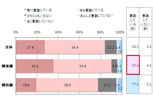 東日本大震災から一年が経過した現在、東日本大震災の存在を尋ねたところ、84.0%の人が「(東日本大震災を)意識している(計)」と回答している。地域別で見ると、関東圏では9割が、関西圏でも7割強が意識している結果である。