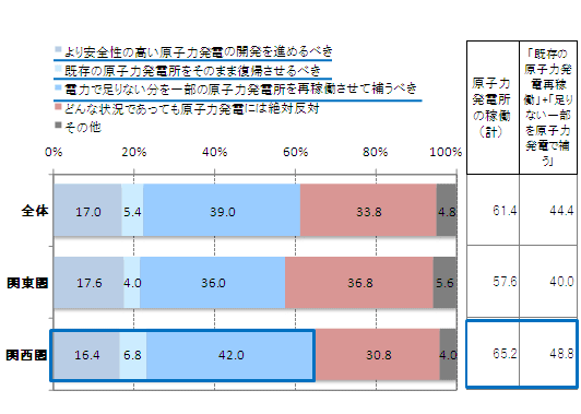 また、原子力発電所の稼働については、全体の6割以上の人がなんらかの稼働に賛成している。特に、関西圏では半数以上の65.2%が賛成の意を表している。