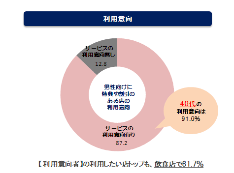 一方で、「レディースデー」や「レディースメニュー」のような女性が優遇されていた特典や割引の男性版には非常に好意的で、87.2%が利用意向を示している。