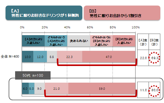 実際に男性に向けたサービスでどういう表記があると、より入店したくなるかを尋ねたところ、【B】男性に限りお会計から1割引き」の方が、【A】男性に限りお好きなドリンクが1杯無料」という表記よりも入店したくなるという結果となった。特に、50代ではその傾向は顕著で8割を占める。