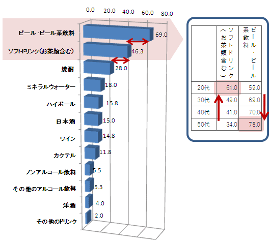 設問の順番が前後するが入店後のドリンクということで言及すると、夜の外食時に好んでよく飲むドリンクのトップは「ビール・ビール系飲料」で、69.0%。次いで、20ポイント以上の差をつけて「ソフトドリンク(お茶を含む)」が46.3%、「焼酎」が28.0%と続く。年代別では、20代には「ソフトドリンク(お茶を含む)」が、50代には「ビール・ビール系飲料」がより支持されている。また、「ソフトドリンク(お茶類)」「ビール・ビール系飲料」は、年代が上がるにつれて徐々に差を増す傾向にある。