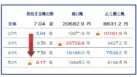 一方、40代は保有する中で一番高い靴の価格も、よく履く靴の価格も共に最も安い結果となった。年代ごとに、嗜好や経済状況などは異なりを見せる。その中でも40代は他年代に比べて各項目で特徴的な数値を表す傾向が見られる。