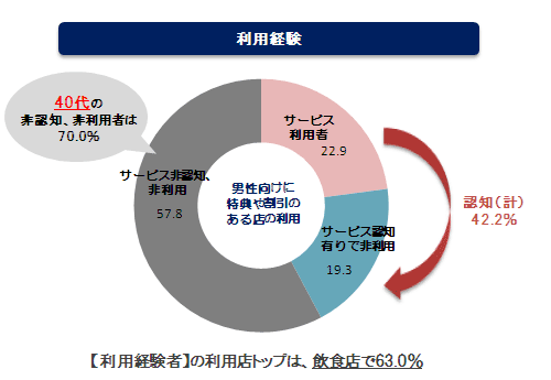 利用経験者は22.9%とまださほど多くはない。しかし、利用したことはないが認知がある層を含めると、サービス自体の認知は42.2%と2倍近くになる。また、今後こういった男性に特典や割引がある店を利用したいと回答する人は、87.2%と非常に高い。特に40代の利用意向が高く唯一9割を超えている。40代は、利用経験では「サービスの非認知、非利用」が全体の中で最も多く、7割を占めていた。
