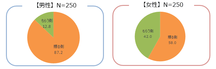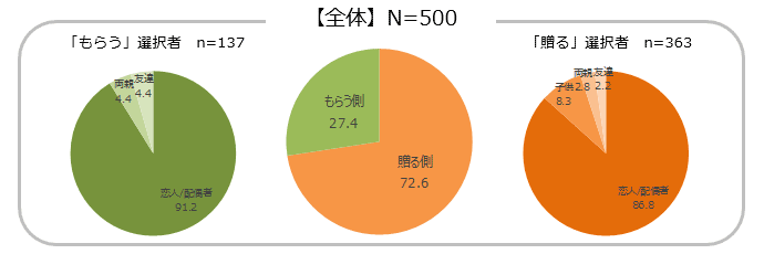 「贈る側」も「もらう側」も、対象として思い浮かべるのは、「恋人/配偶者」が最も多い結果となった。男女別に見ると、男性は9割弱が「贈る側」をイメージするのに対し、女性は「贈る側」が6割と、男性よりも「もらう」意識が強い結果となった。