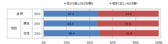 ■プレゼント選びは、「自分で選んだものを贈る」と「相手に欲しいものを聞く」がほぼ同数。 N=500