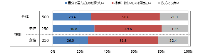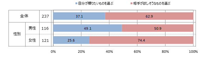 「自分で選んだものを贈る」回答者に、プレゼント選びで意識していることを尋ねたところ、男性は「自分が贈りたいものを選ぶ」と「相手が欲しそうなものを選ぶ」がほぼ半数のところ、女性は「相手が欲しそうなものを選ぶ」が7割強であった。女性の方が、相手主体でプレゼントを選ぶ傾向があるようだ。
