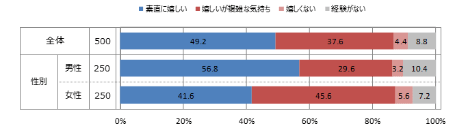男女別で見ると、「嬉しいが複雑な気持ち」の割合が、女性の方が16%上回る。女性の方が、実際にもらったもの次第で、素直に喜べない様子が窺える。