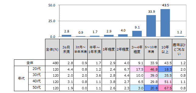 どの年代も「5~10年未満」または「10年以上」の回答者が最も多く、年代問わず、5年以上続けているものを趣味と挙げている人が多いようだ。