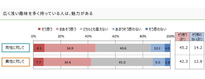 限定した趣味を追及している人に魅力を感じる割合に比べ、同性に対しては20ポイント以上、異性に対しては15ポイント程度低く、広く浅い趣味の方が魅力度は低いことが分かった。