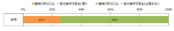 趣味に一定の条件があると思う人は、「一定期間継続的に行っている」「知識がある」「お金を費やしている」等、ただ好きなだけでは趣味と言えないと考えている傾向があり、一定の条件がないと思っている人は、「自分が趣味だと思えば趣味」「自由」と考えている人が多かった。