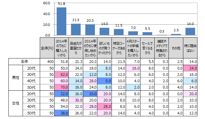 しかし、女性は男性に比べると「2014年のうちに購入したい」という意識は低く、「欲しいものが見つかったから」が、男性の1割未満に対し、女性は2割以上と、手帳にデザイン性を求めている様子が窺える。