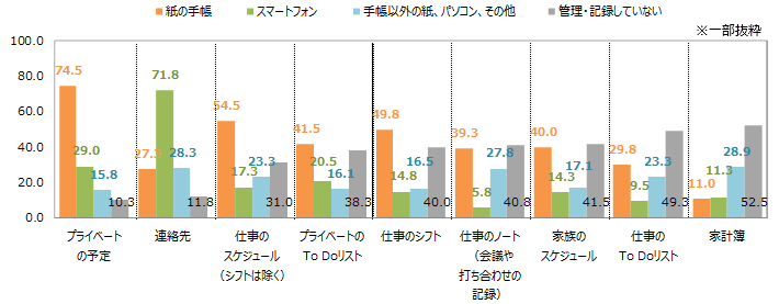 唯一スマートフォンで管理している人の方が多いのが、連絡先で71.8%がスマートフォンで管理している。殆どの手帳に付録としてついている「アドレス帳」を使用している人は、今では3割以下に留まるようだ。