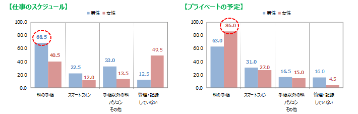 ・一方、プライベートの予定では、紙の手帳で管理している女性が86.0%となり、女性の手帳を選ぶ基準は、プライベートでの利用を重視している傾向がありそうだ。