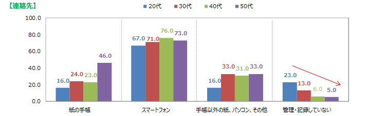 年代別に見ると、年代が上がるにつれて連絡先を管理している人が多く、50代の半数近くは手帳でも管理していることが分かった。若年層ほど、連絡先を管理・記録するという意識は低く、連絡先を管理していなくても、SNS等を通じて、すぐに調べることができる時代を反映している結果と言えそうだ。
