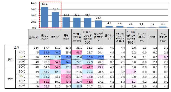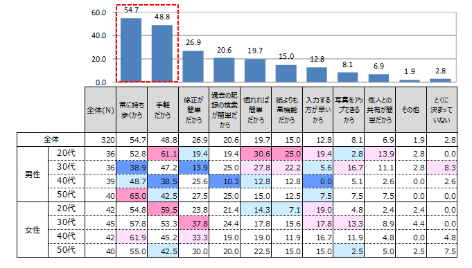 次いで「楽だから」が5割、「簡単だから」「手で書くのが1番早いから」が3割強と続く。しかし男女別で見ると、「簡単だから」を選択した男性は、女性と比べて約20ポイント低く、「手で書くのが1番早い」「社会人としての常識だと思う」の方が上回る結果となった。男性は仕事で使用することを考慮して、手帳の機能は、簡単さよりも、スピードやマナー面を重視している様子が窺える。