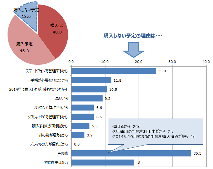 まず、事前調査で、2014年手帳保有者に、2015年も手帳を購入する予定かと尋ねたところ、「購入しない」と回答したのは1割強であった。そのうち、「スマートフォンで管理するから」は4人に1人となり、手帳からスマートフォンへ移行する人は、全体の僅か3%程度に留まる結果となった。