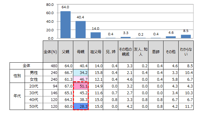 年代別に見ると、年齢が上がるにつれて、母親に名付けられた人の割合が減少している。50~60年前は、子どもの名付けに関与した母親は、3割にも満たないことがわかった。