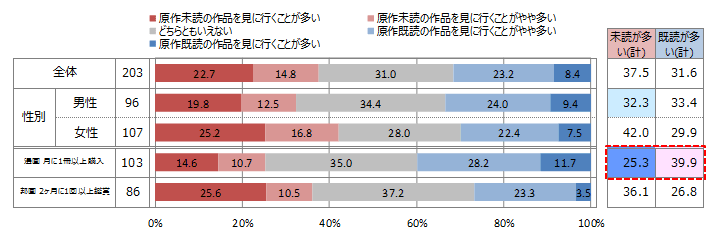 次に、映画館で漫画の実写映画を見たことがあるかを問うと、「見たことがある」 と回答した人は全体の 7 割弱であったが、漫画を 月に 1 冊以上購入する 人と、邦画 を 2 ヶ月に 1 回以上鑑賞する 人のうち、「 見たことがある」 と回答 した人は、ともに 8 割以上という結果となり、普段から漫画や映画に高頻度 で接触している人 の方が 、漫画 原作の実写映画を映画館へ見に行った経験が多いことが分かった 。次いで 、映画館で漫画の実写映画を見たことがある人を対象に、原作“既読”と“未読”のどちらの実写映画 を見 に行くことが多いかを尋ねると、漫画を 月に 1 冊以上購入する 人で は、未読作品を見に行くことが多い人は 25.3 % 、既読 作品が多い 人は、それを 15 ポイントほど上回る 39.9 %となった 。漫画の実写映画化が発表されると、漫画ファンから の「 原作のイメージを壊したくない」という否定的な意見が出てくるが、今回の調査では 、普段から漫画を月に 1 冊以上購入 している人は 、未読作品よりも既読作品の実写映画を見に行く割合が高い結果となった。