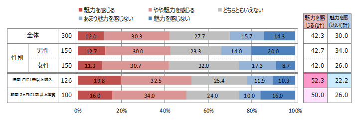 ■ 漫画を月に1冊以上購入する人、邦画を2ヶ月に1回以上鑑賞する人のどちらも、「人気漫画の実写化」に魅力を感じる割合は半数以上。N=300