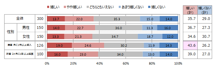 ■ 漫画を月に1冊以上購入する人、邦画を2ヶ月に1回以上鑑賞する人ともに、好きな漫画の実写映画化を嬉しいと感じる人は4割ほどに留まった。N=300