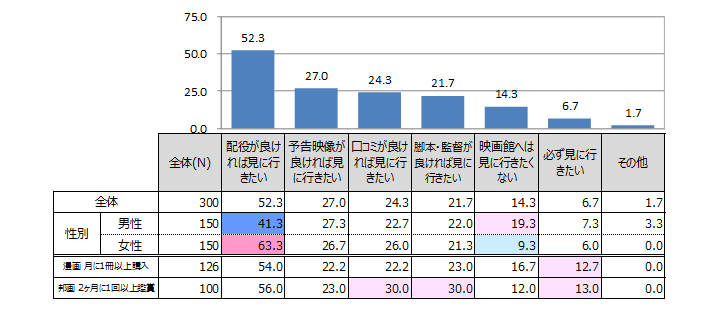 一方で「映画館へは見に行きたくない」と回答した男性が2割に対し、女性は1割ほどに留まり、女性の方が、配役さえ良ければ、映画館まで足を運ぶポテンシャルが高いと言えそうだ。