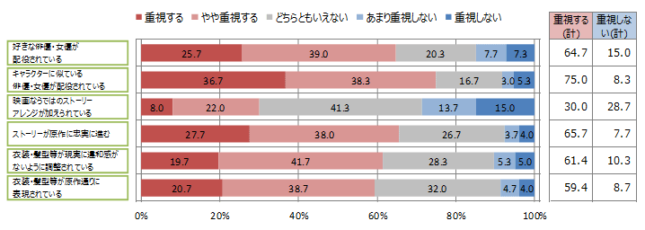 Q.次にあげる項目のうち、漫画の実写映画化に関してどのくらい重視するかを、それぞれお選びください。(それぞれ1つ選択)