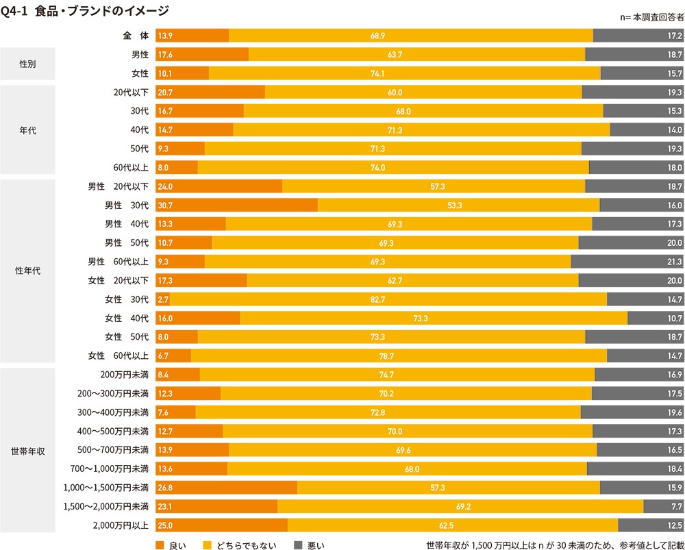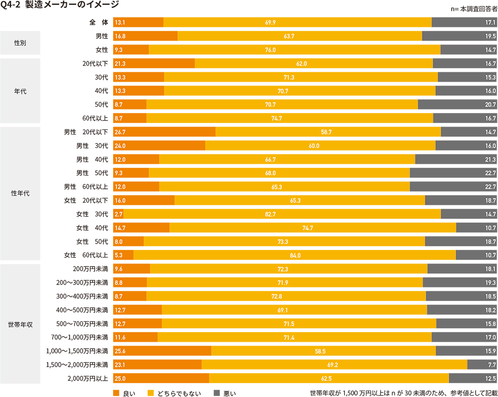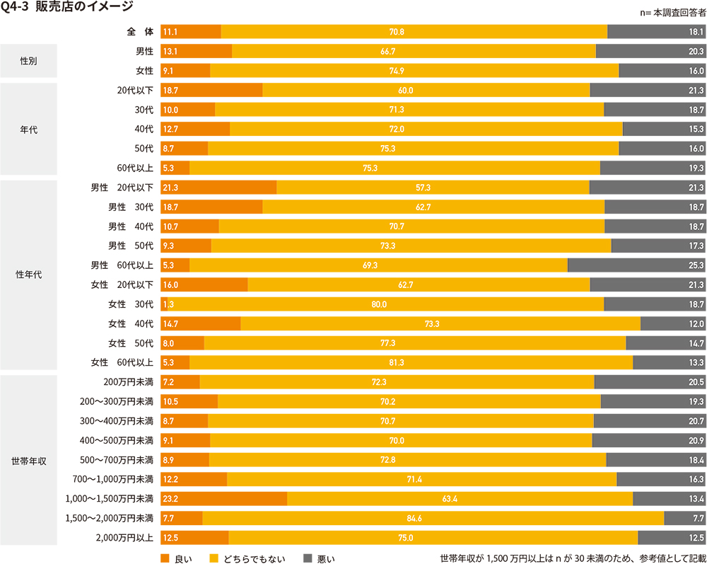 性年代別では、30代以下の男性が他に比べ「良い」印象を持っており、世帯年収別では、1,000万円以上の層が、「良い」印象を持っていることがわかる。