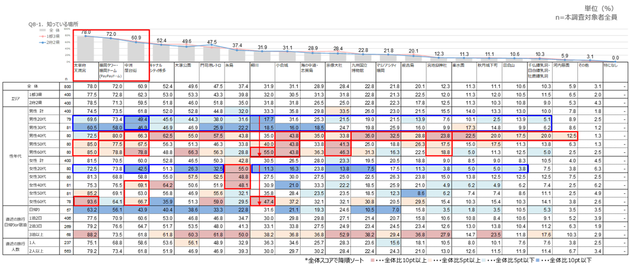 全体では、「太宰府天満宮」が8割弱で最多、「福岡タワー・福岡ドーム」が7割強、「中州屋台街」が6割強で続く。