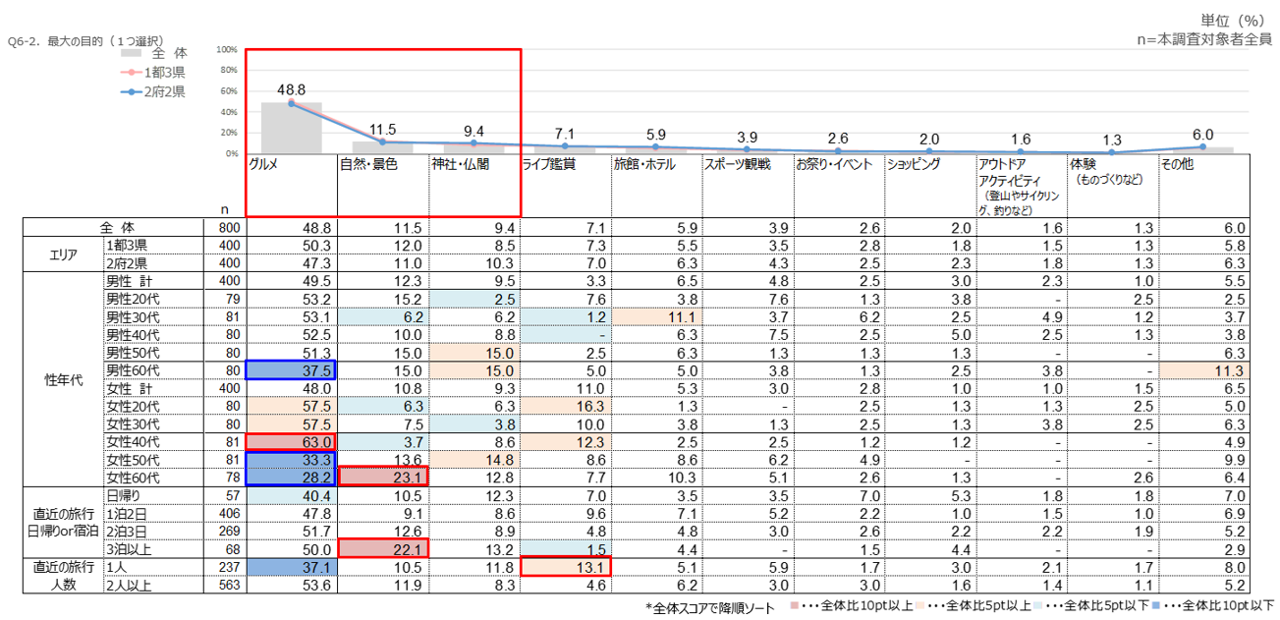 全体では、「グルメ」が5割弱で最多、「自然・景色」が1割強、「神社・仏閣」が1割弱で続く。
