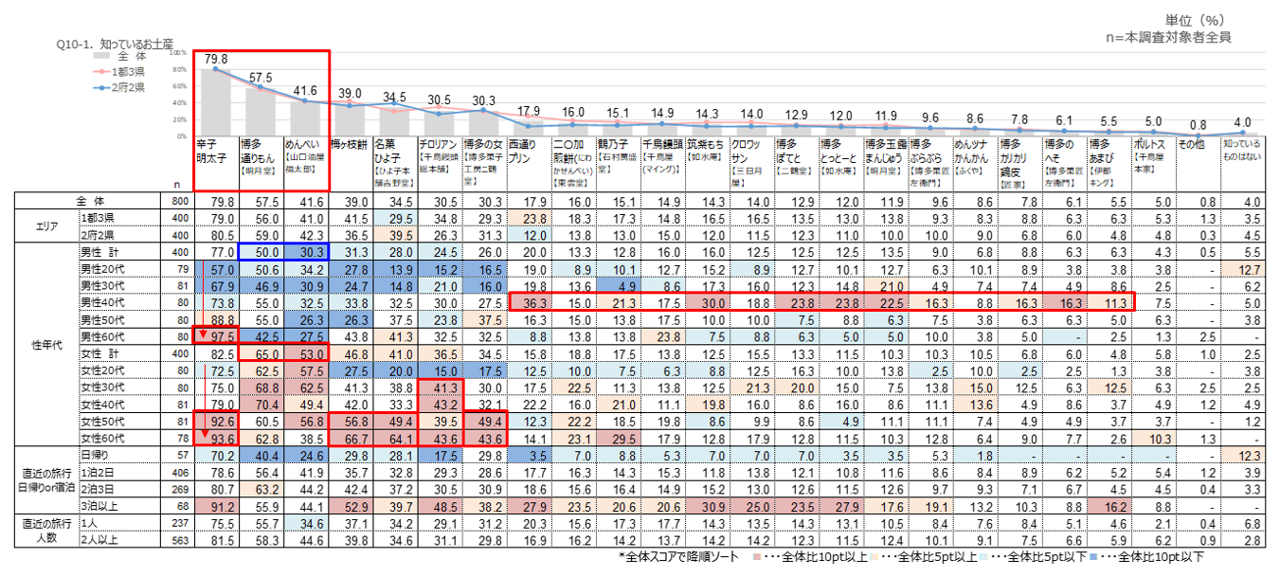 全体では、「辛子明太子」が8割弱で最多、他の項目に差をつけた。次いで、「博多通りもん」が6割弱、「めんべい」が4割強で続く。