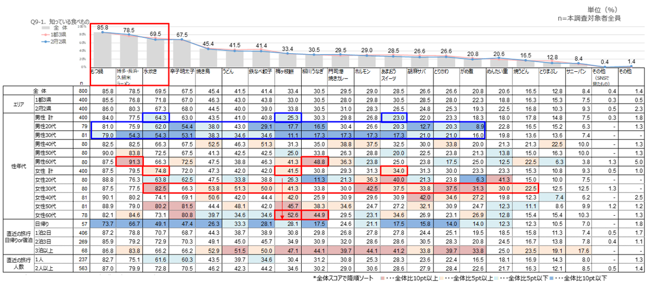 全体では、「もつ鍋」が8割半ばで最も高く、「博多・長浜・久留米ラーメン」が8割弱、「水炊き」が7割弱で続く。