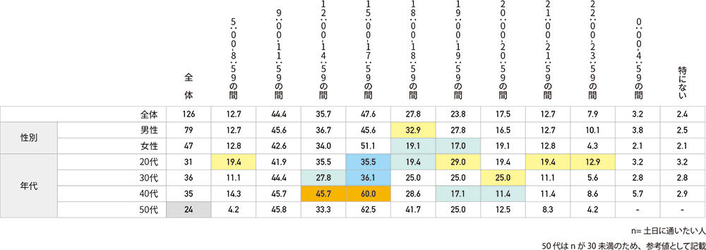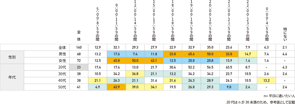 年代別では、40代が他の年代に比べ5:00~8:59の時間を利用する傾向が高く、約2割を占める。50代は他の年代に比べ、9:00~11:59の時間を利用する傾向が高く、逆に21:00~23:59の時間を利用する傾向が低い。