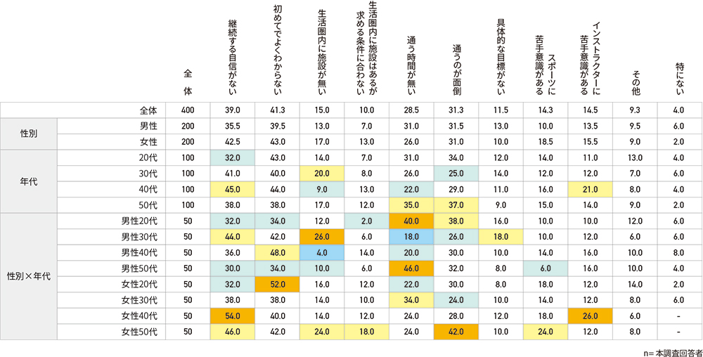 性別×年代でみると、20代男性と50代男性は「通う時間が無い」が高く、30代男性は「生活圏内に施設が無い」が高い。また、20代女性は「初めてでよくわからない」が高く半数以上を占める。40代女性は「継続する自信がない」「インストラクターに苦手意識がある」が高く、50代女性は「通うのが面倒」が高い。上記のように、性別×年代では大きな違いがみられた。