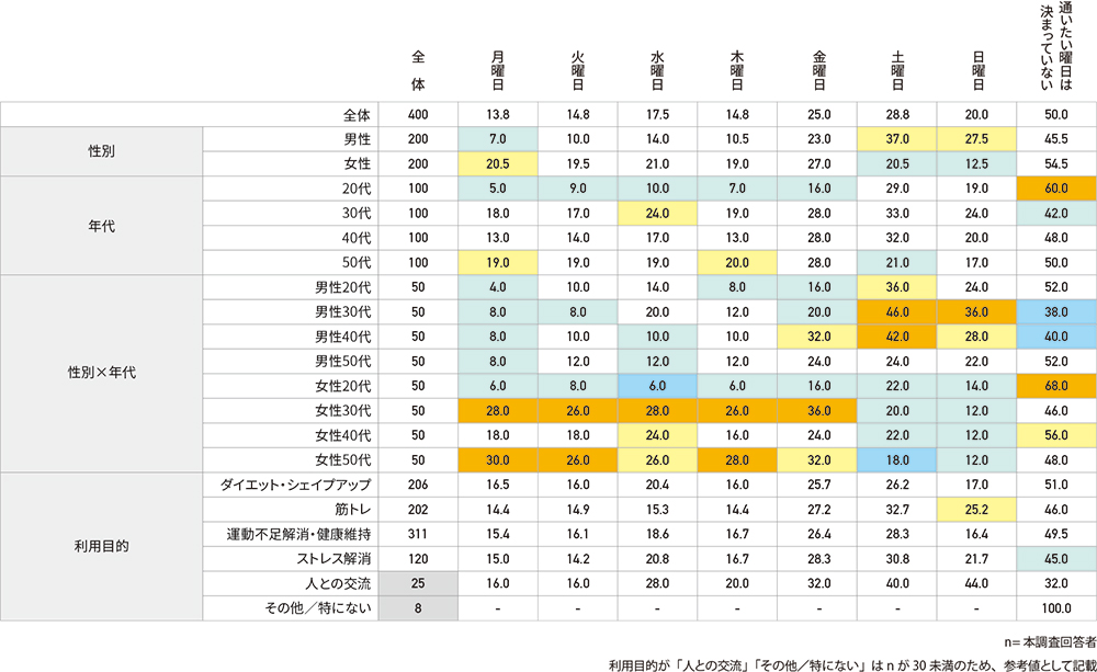 30代~40代男性は「土曜日」「日曜日」に行く傾向が高く、逆に、30代女性と50代女性は月曜日~金曜日の平日に行く傾向が高い。20代女性は「通いたい曜日は決まっていない」が7割近くを占める。