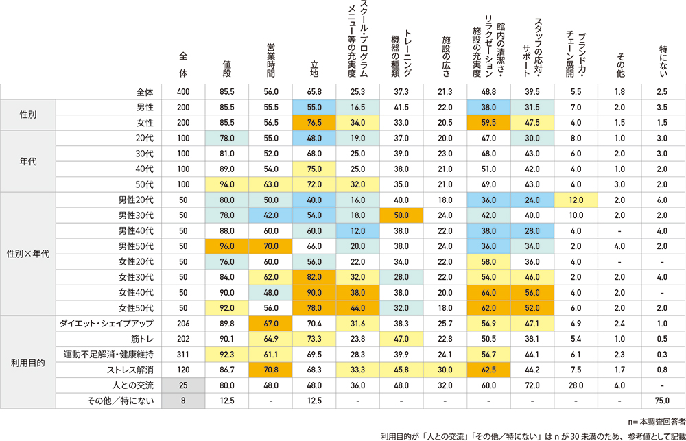性別×年代では、30代男性は他の層と比べ「トレーニング機器の種類」を重視する傾向が高く、約半数を占める。50代男性は、「値段」「営業時間」を重視する傾向が高い。一方で、男女ともに20代は他の層に比べ、重視する項目が少ない。
