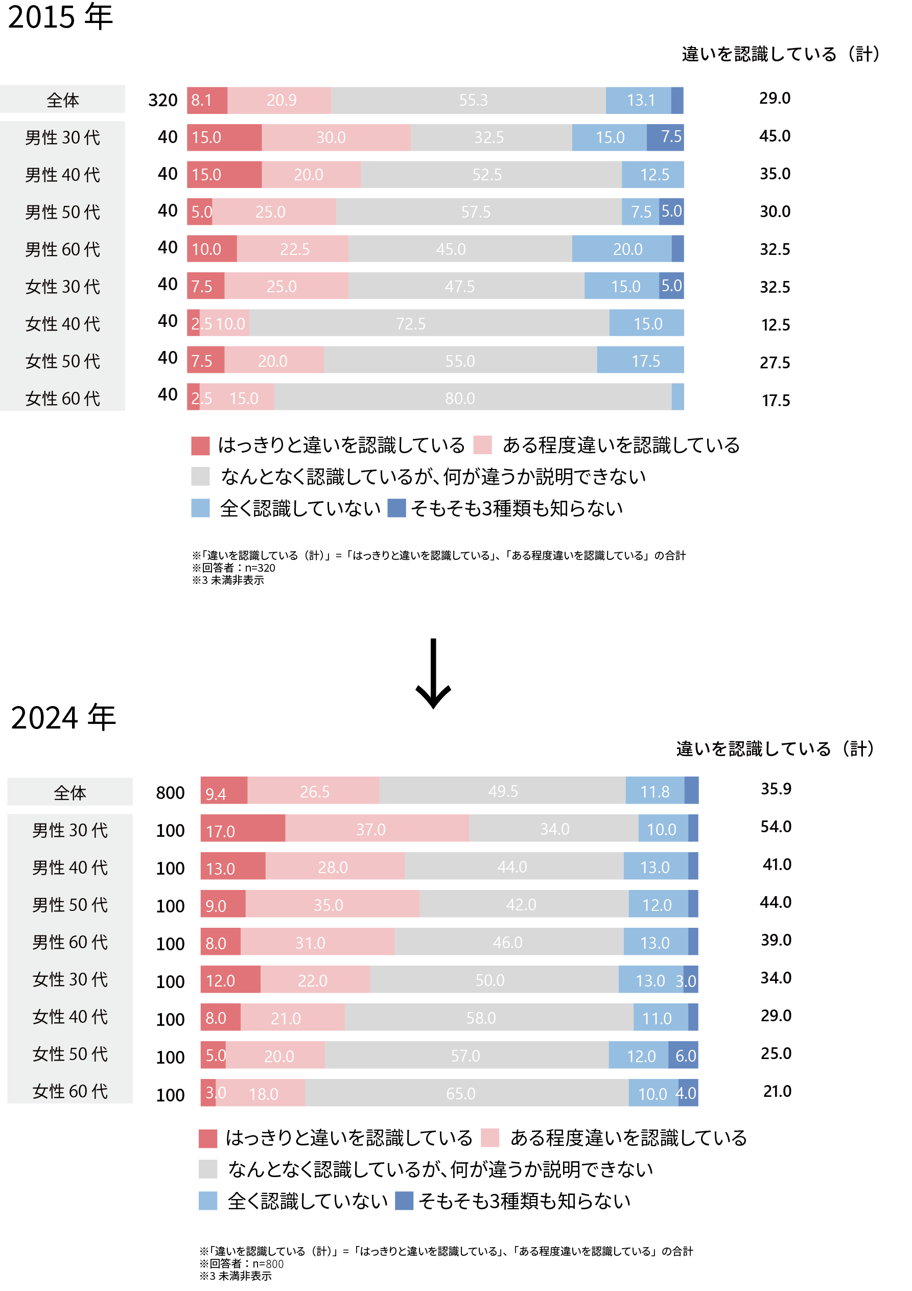 次に、認識の違い別に見ると、「認識しているが、何が違うか説明できない」と「全く認識していない」、「そもそも3種類」も知らないで、それぞれ半分以上の層で2015年から2024年で減少。特に、「認識しているが、何が違うか説明できない」は男性50代、女性40代、60代で約15~16pt減少している。一方で、「ある程度違いを認識している」は、女性30代以外増加しており、男性50代と女性40代は10~11pt増加した。