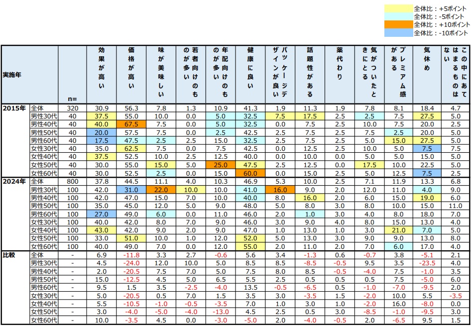 続いて、性年代別で見ると、男性30代で「味が美味しい」と「パッケージデザインが良い」が他の層と比べ、選択率が高い。一方で、男性30代で「価格が高い」、男性60代で「効果が高い」が他の層と比べ、選択率が低い傾向にあった。